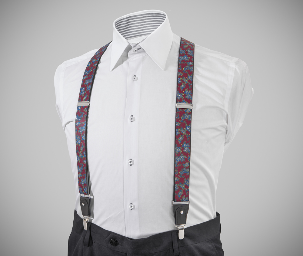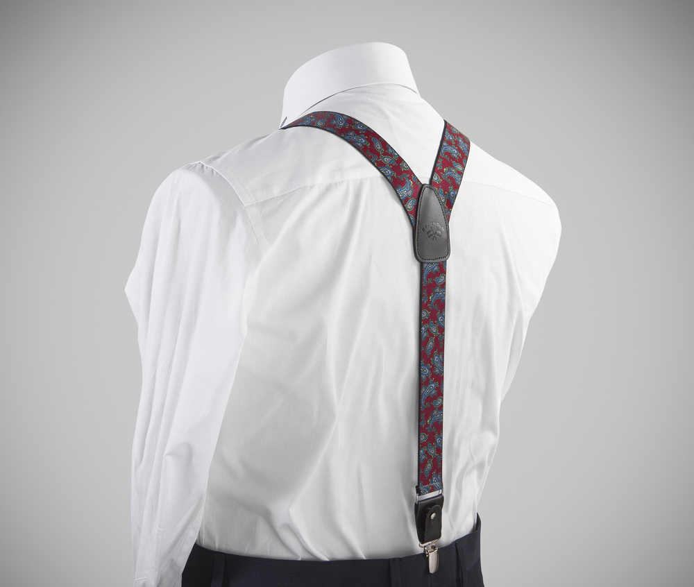 "Elegant, adjustable-size braces, 35mm width, made with fine, resilient material, in a fancy-finishing red-blue colour. Metal chrome clip and leather-strap button fasten, included."