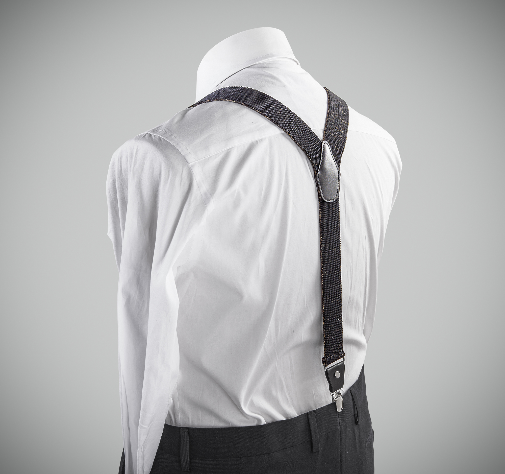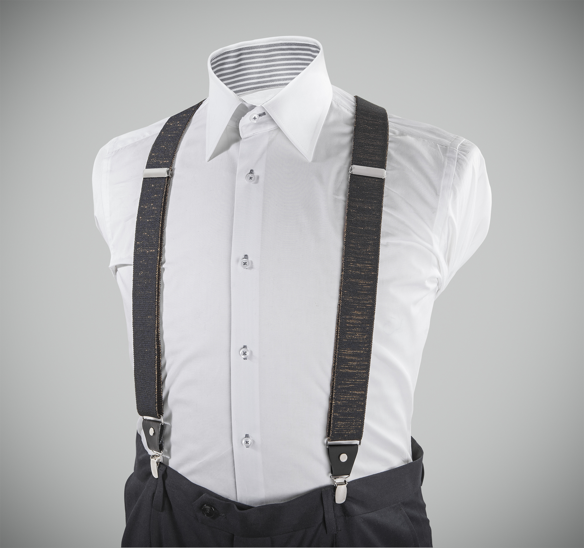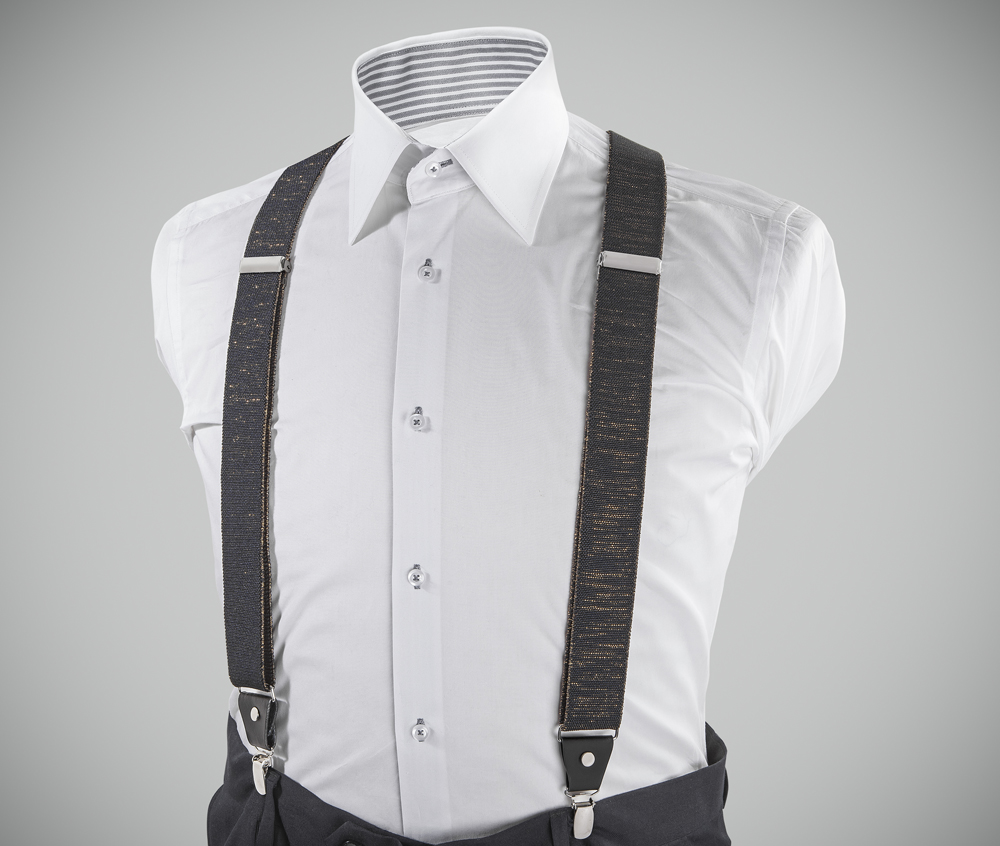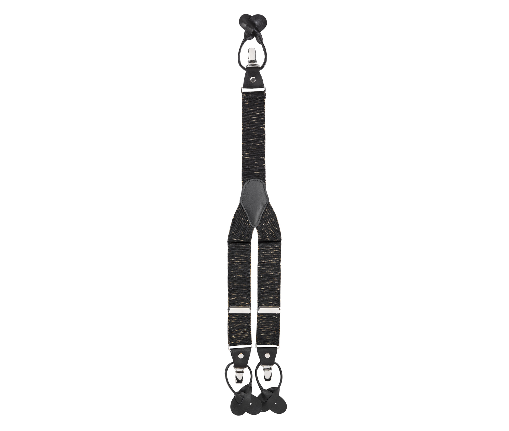 "Brilliant, adjustable-size braces, 35mm width, realised in exquisite, resilient solid black material, with a sparkling gold-colour finishing. Metal chrome clip and leather-strap button fasten, included."
