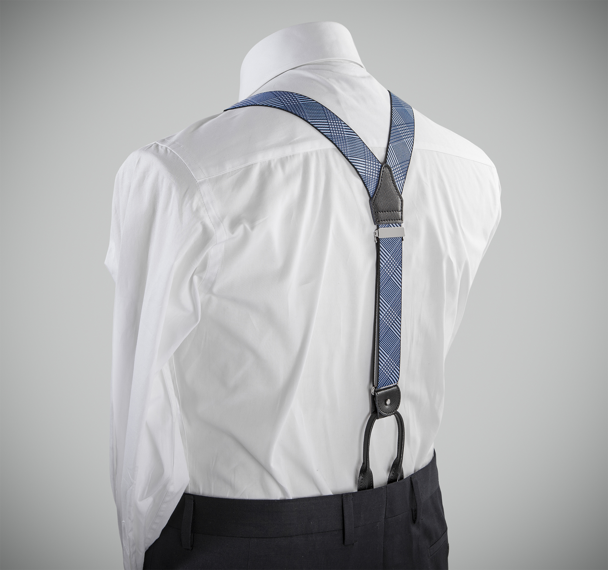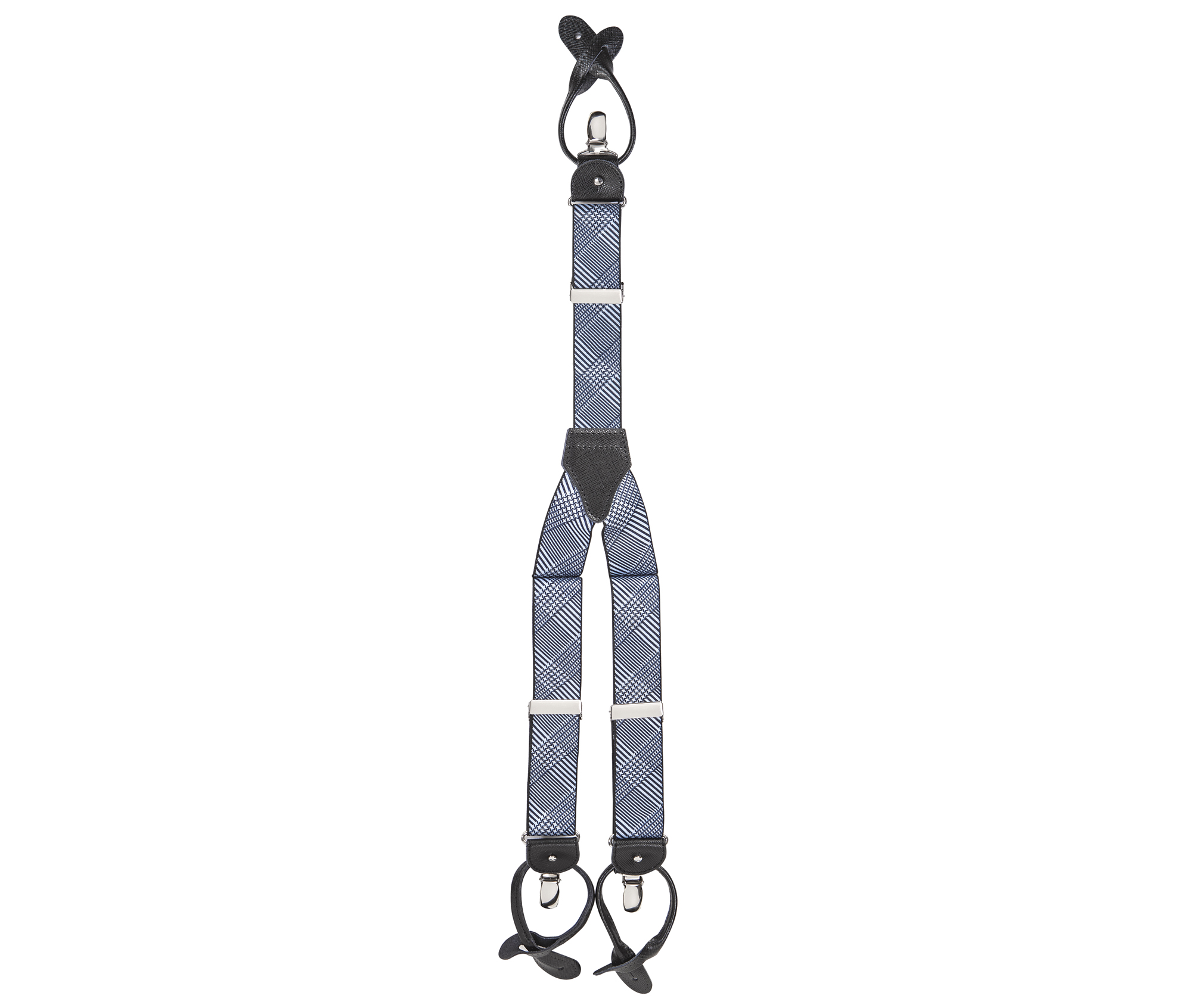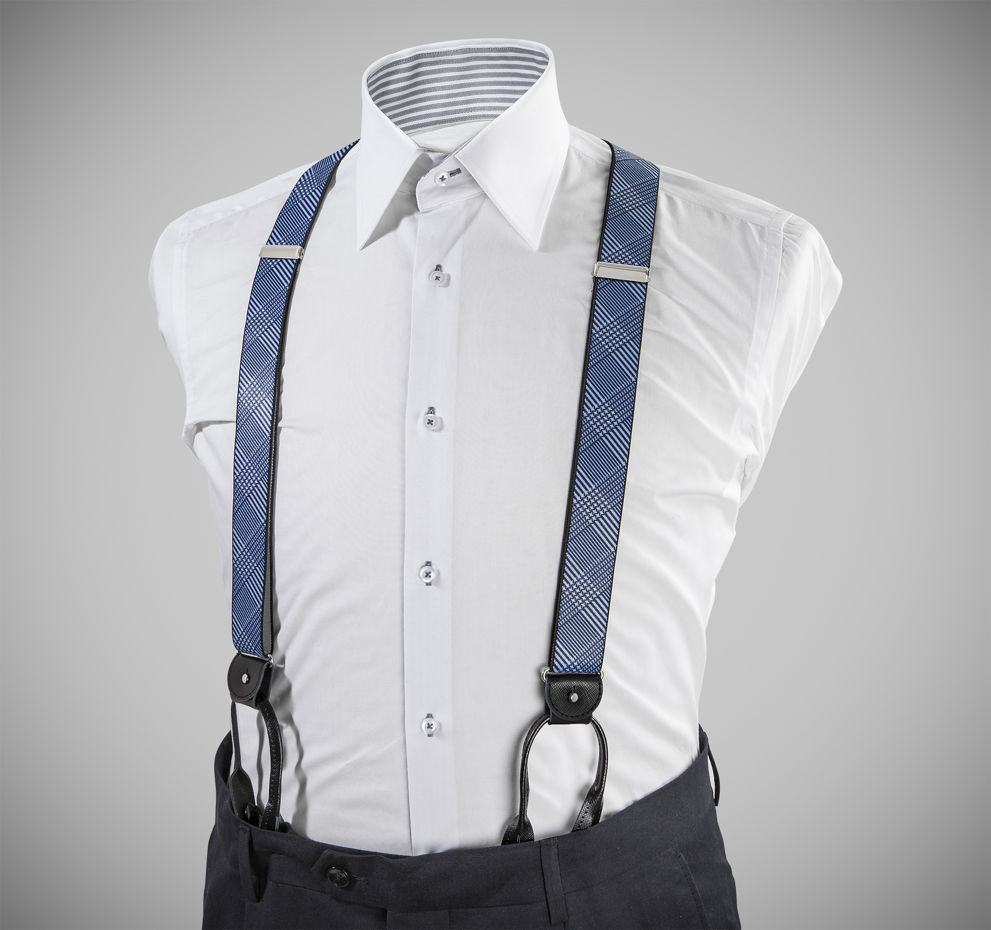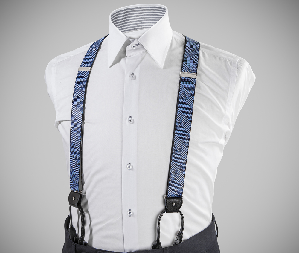 "Elegant, adjustable-size braces, 35mm width, released in exquisite, resilient material, with a lovely blue-white slanted stripes finishing. Metal chrome clip and leather-strap button fasten, included."