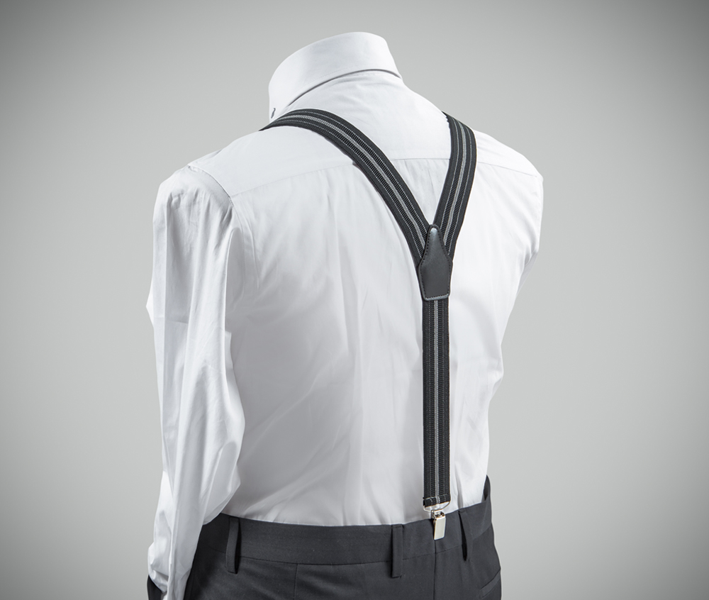 "Elegant, adjustable-size braces, 35mm width, realised in exquisite, resilient material, black and grey vertical stripes finishing. Metal chrome clip and leather-strap button fasten, included."