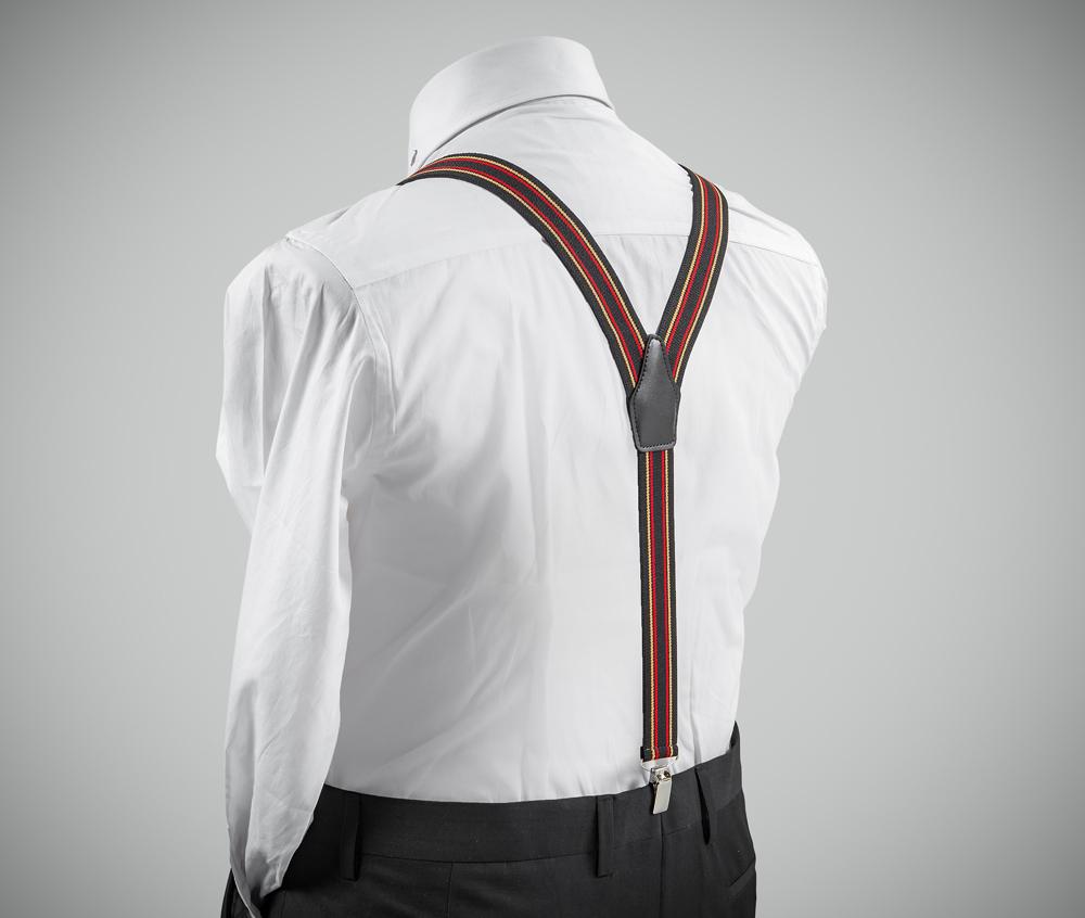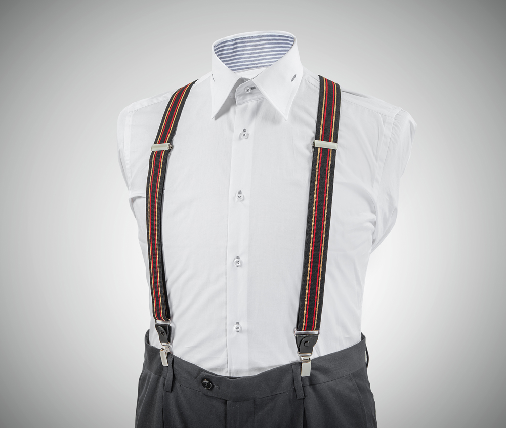 "Elegant, adjustable-size braces, 35mm width, realised in exquisite, resilient material, solid black finishing with yellow and red vertical stripes . Metal chrome clip and leather-strap button fasten, included."