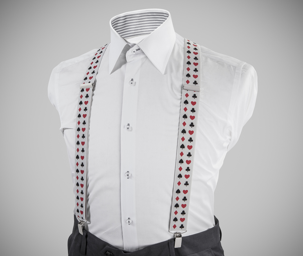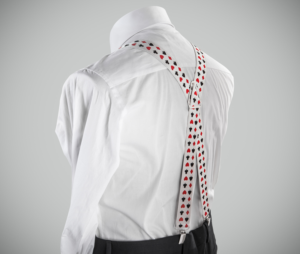 "Adjustable-size braces, 35mm width, realised in exquisite, resilient material , dual solid-colour, dark-green + red. Metal chrome clip and leather-strap button fasten, included."