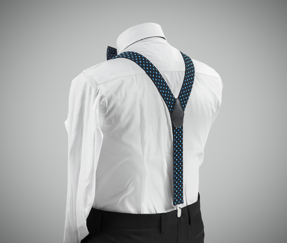 "Exquisite, adjustable-size braces + bow tie combined set, 35mm width, made with fine, resilient material, finished in a dark-blue colour with blue and indigo dots. Metal chrome clip and leather-strap button fasten, included."