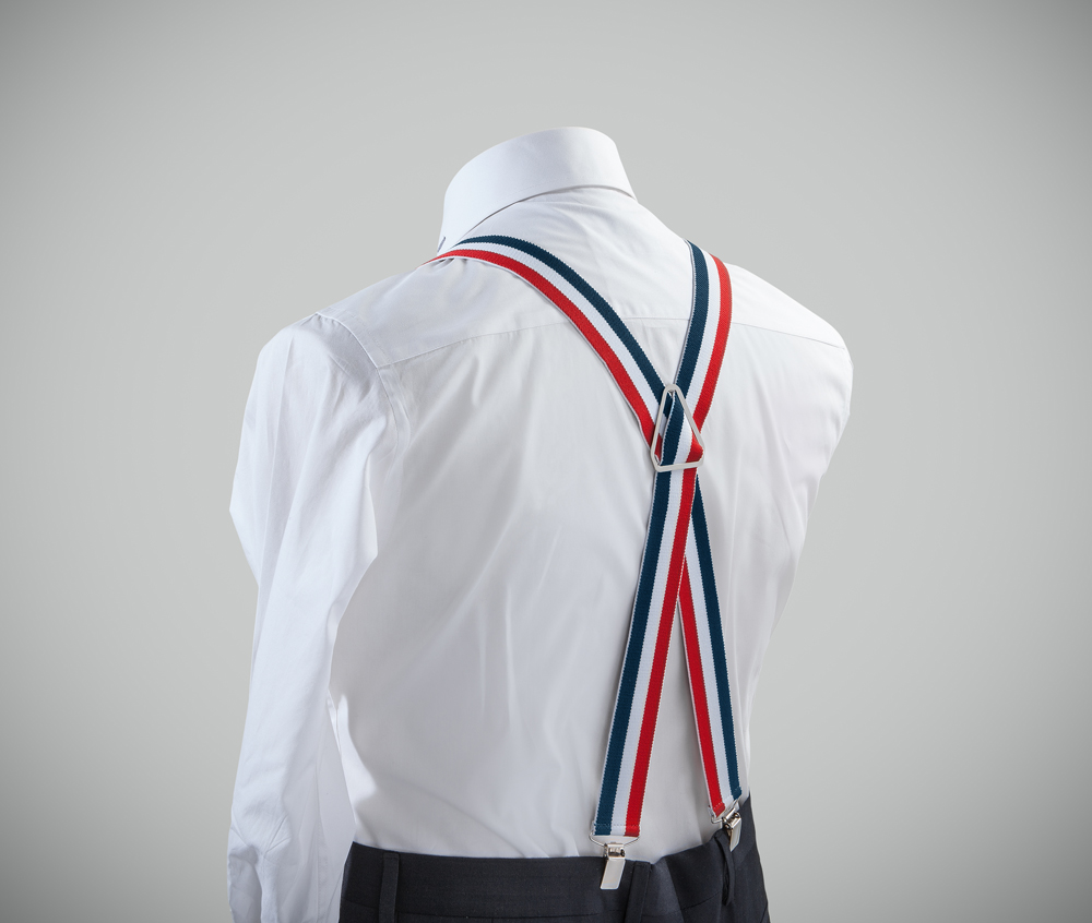 "Adjustable-size braces, 35mm width, realised in exquisite, resilient material , triple solid-colour, blue + white + red. Available with metal chrome clip fasten."