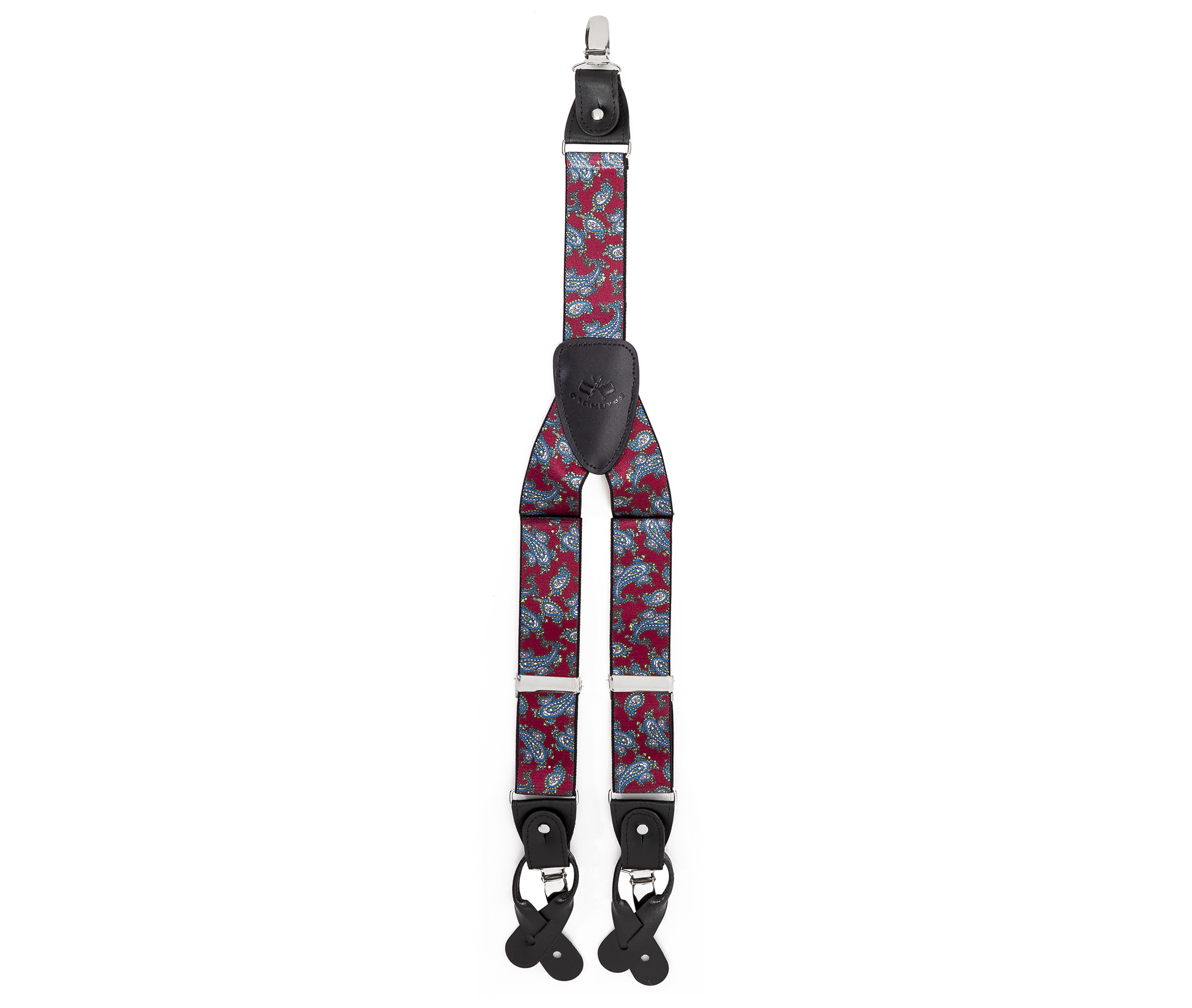"Elegant, adjustable-size braces, 35mm width, made with fine, resilient material, in a fancy-finishing red-blue colour. Metal chrome clip and leather-strap button fasten, included."