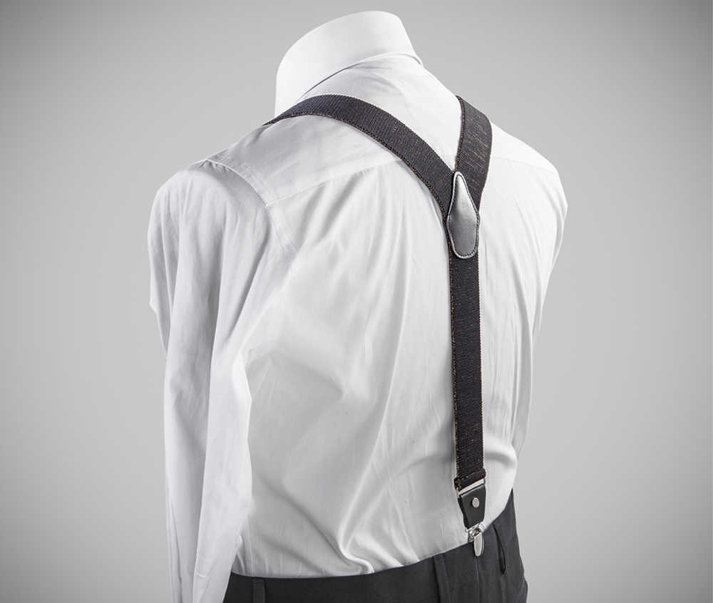 "Brilliant, adjustable-size braces, 35mm width, realised in exquisite, resilient solid black material, with a sparkling gold-colour finishing. Metal chrome clip and leather-strap button fasten, included."