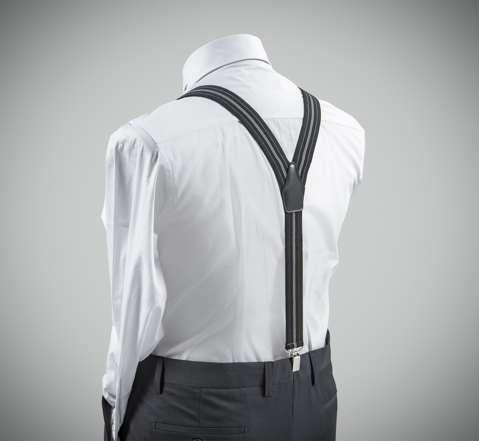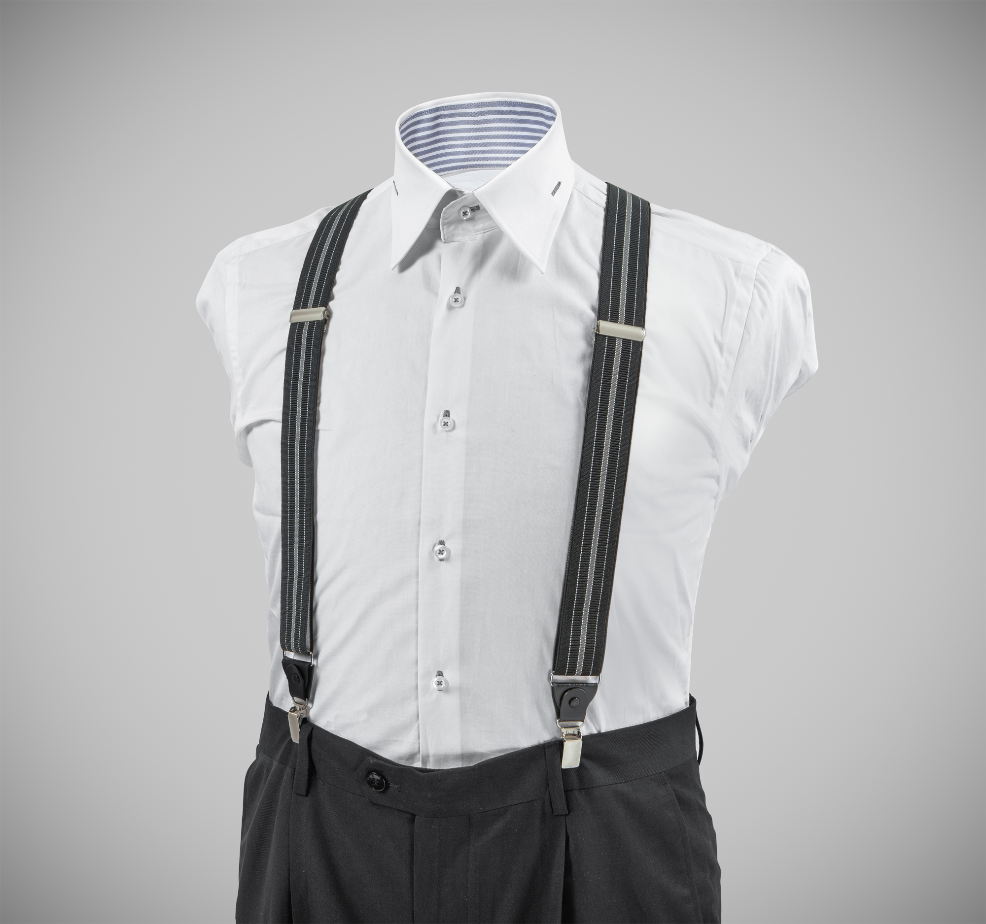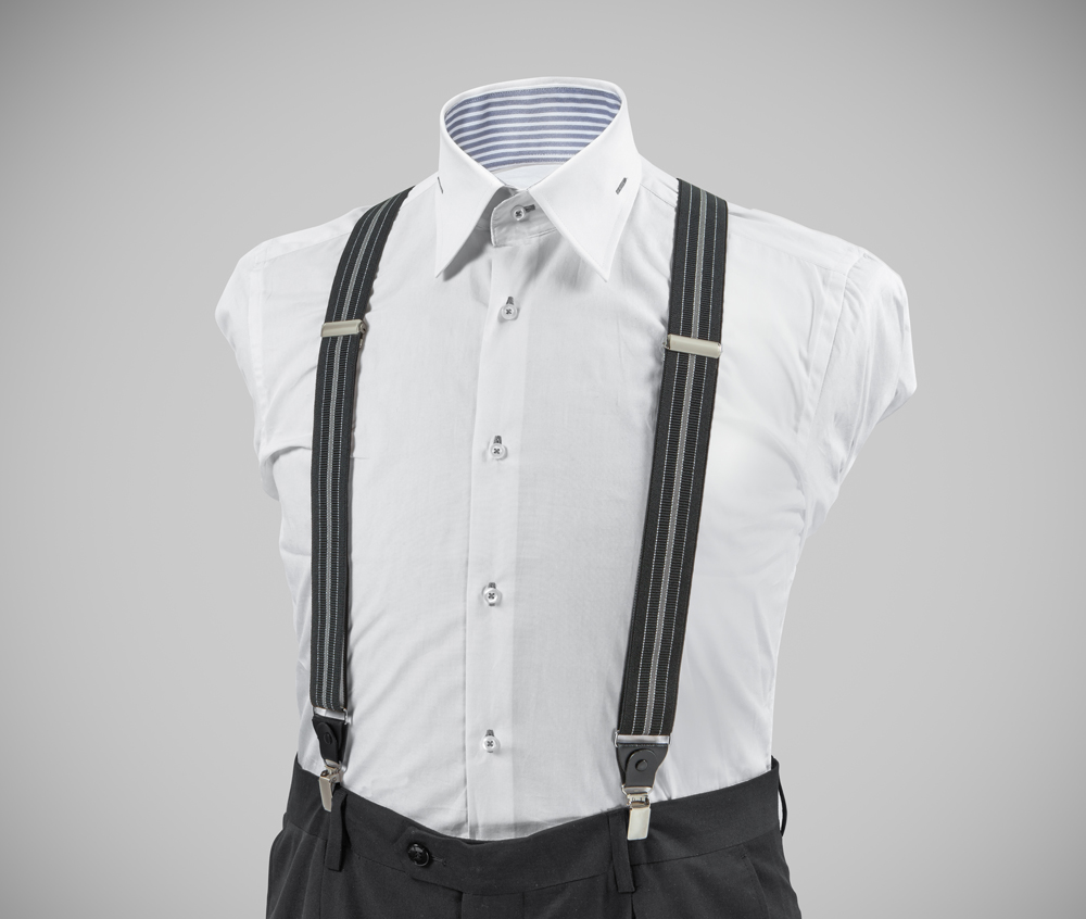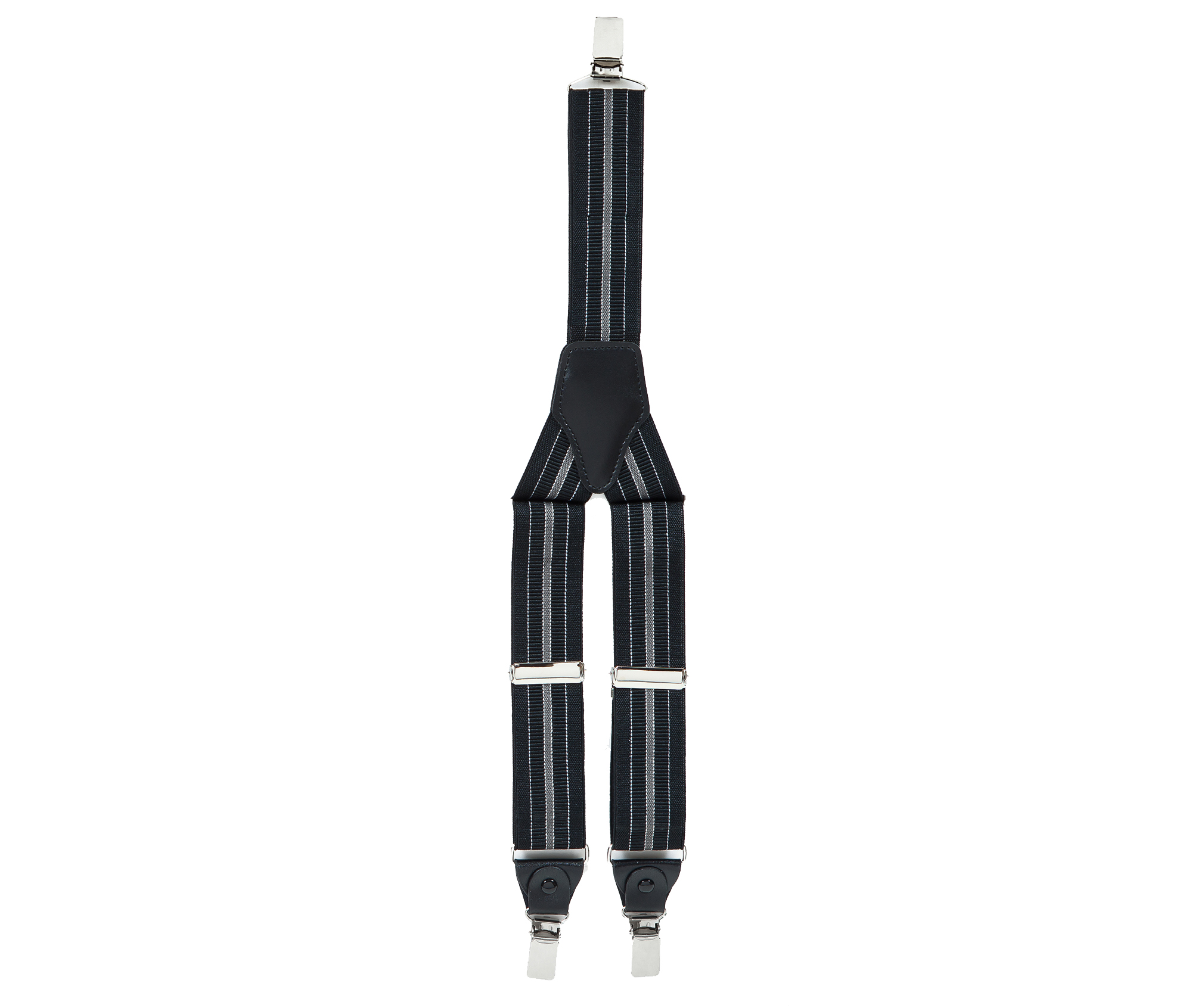 "Elegant, adjustable-size braces, 35mm width, realised in exquisite, resilient material, black and grey vertical stripes finishing. Metal chrome clip and leather-strap button fasten, included."