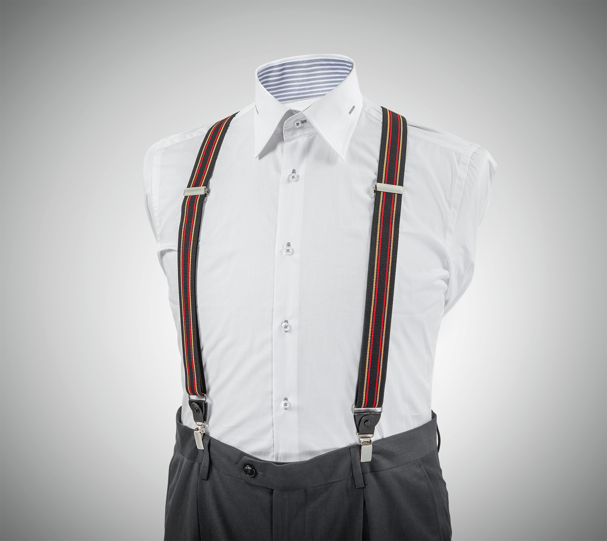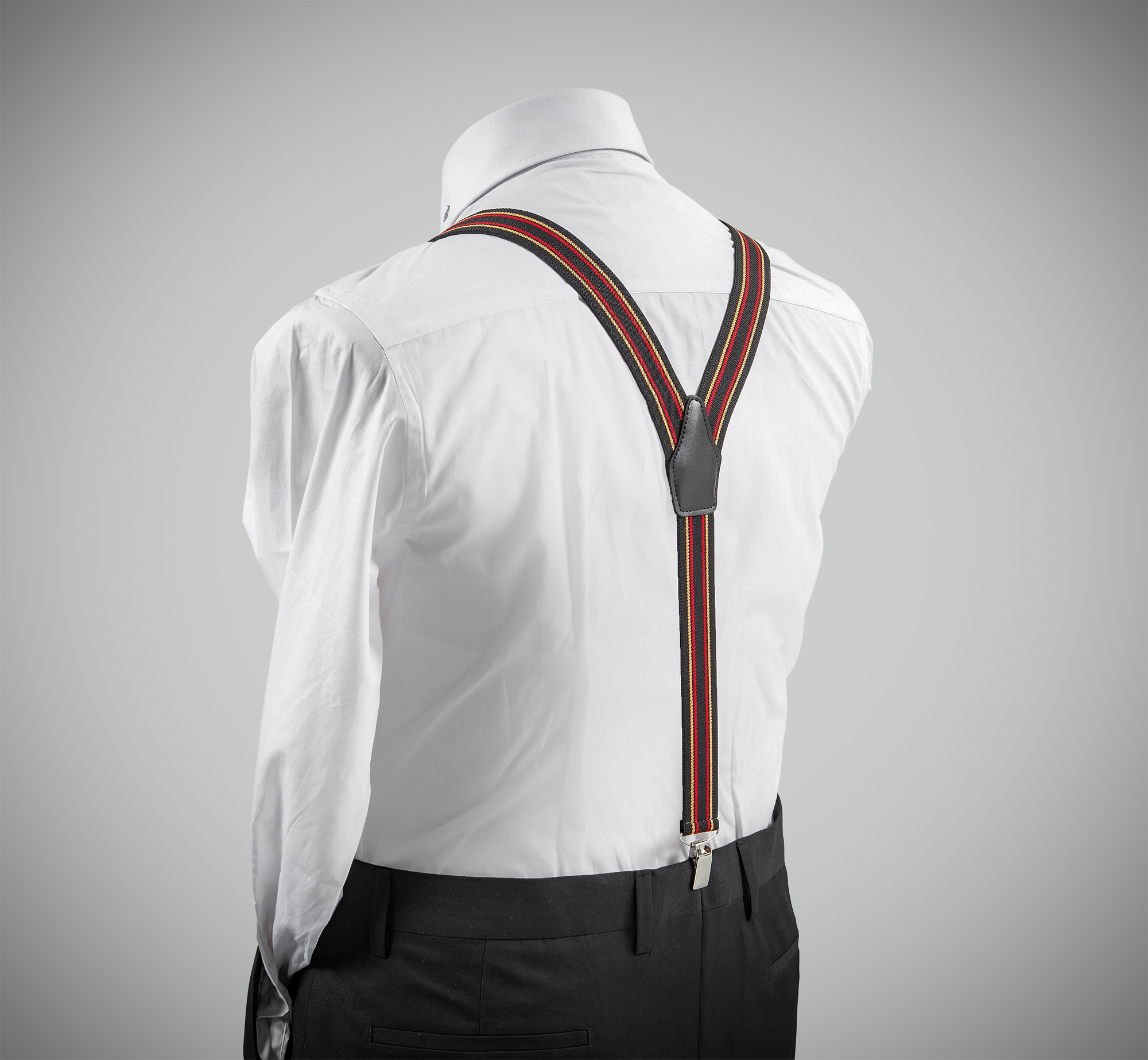 "Elegant, adjustable-size braces, 35mm width, realised in exquisite, resilient material, solid black finishing with yellow and red vertical stripes . Metal chrome clip and leather-strap button fasten, included."