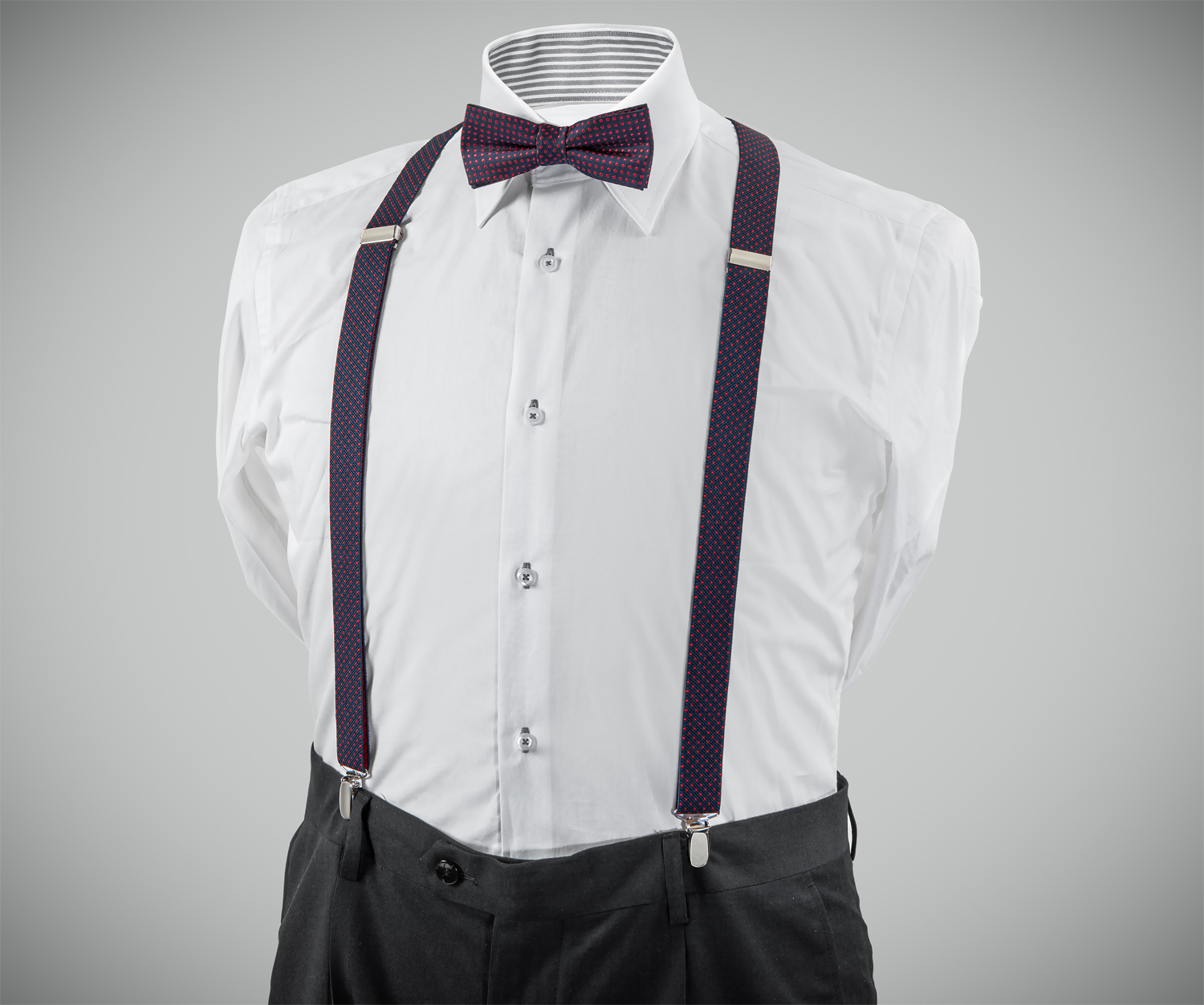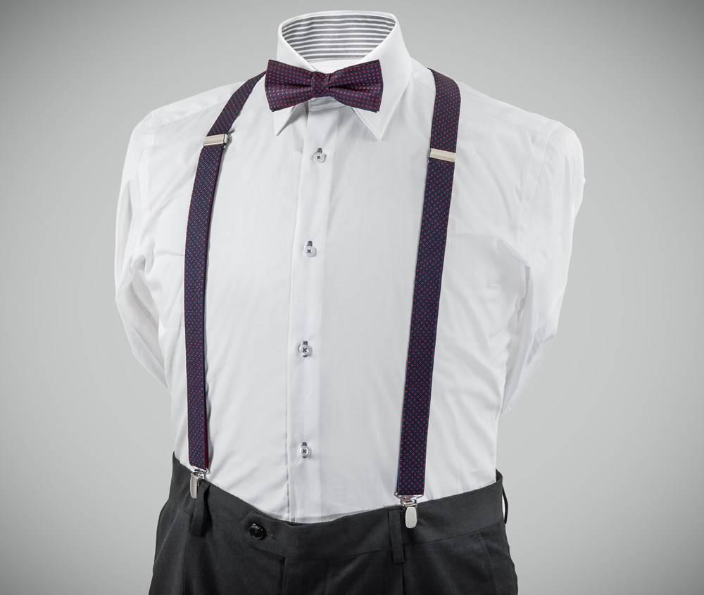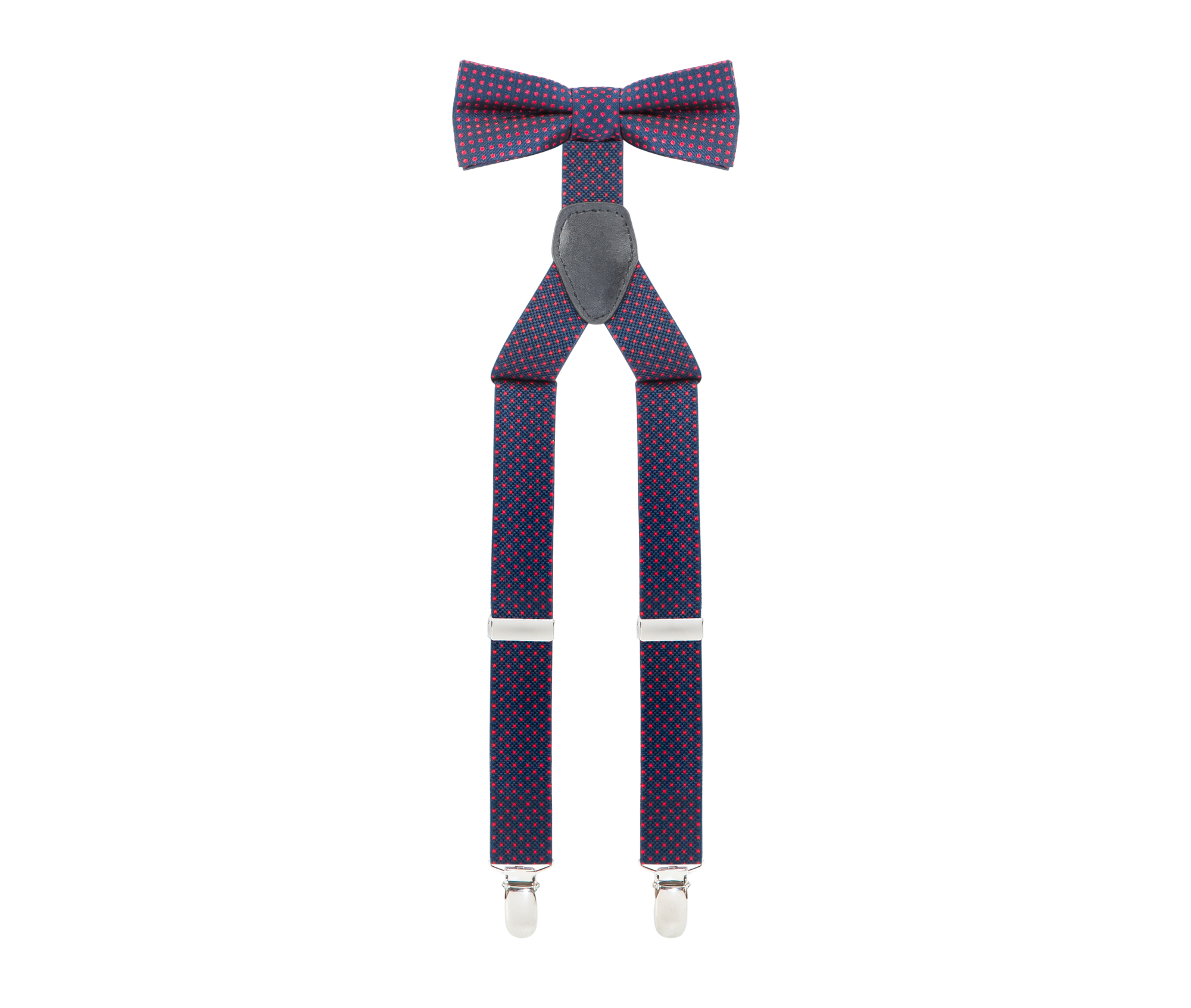 "Exquisite, adjustable-size braces + bow tie combined set, 25mm width, made with fine, resilient material, Navy colour finishing with red dots. Available with metal chrome clip fasten."