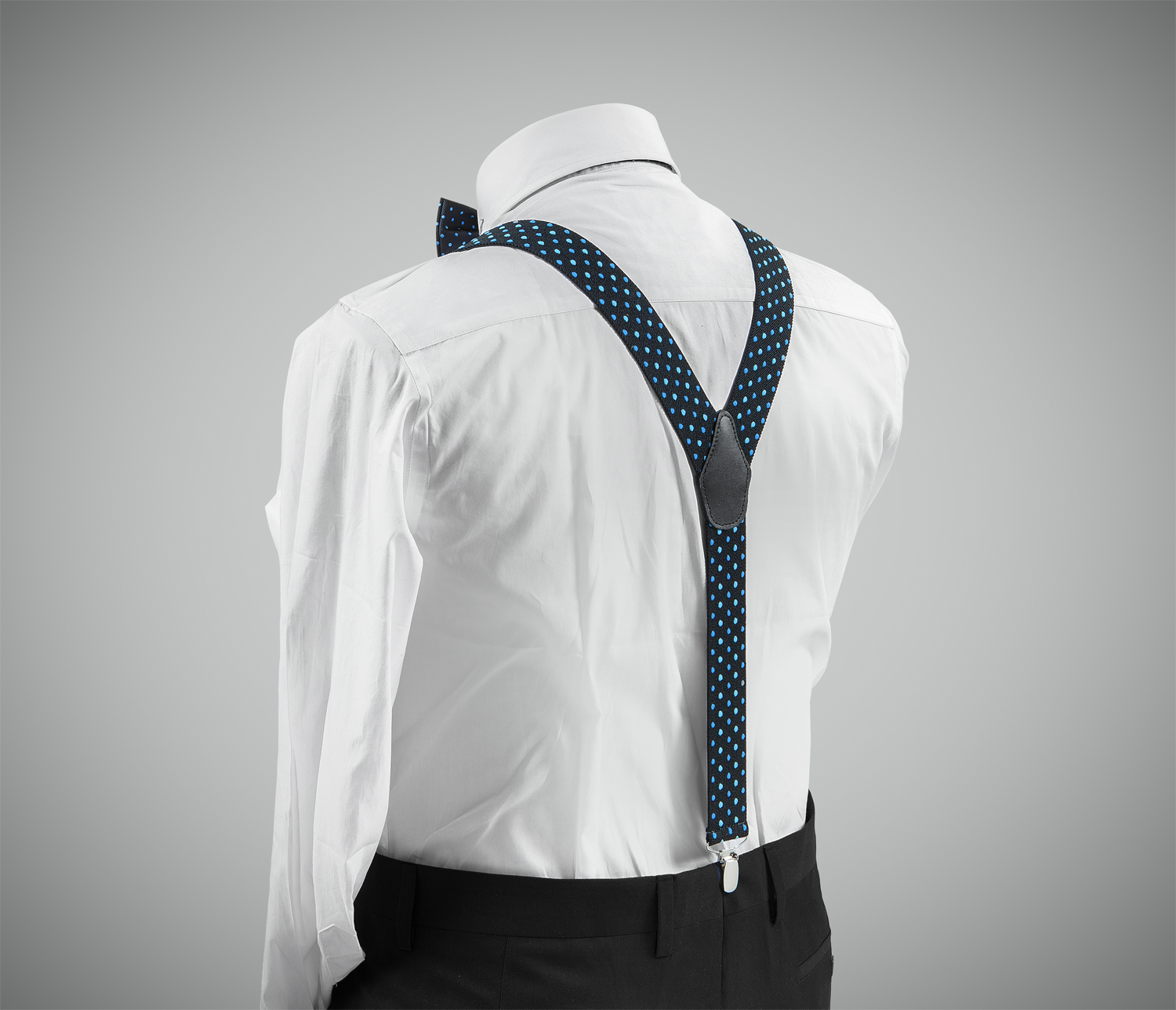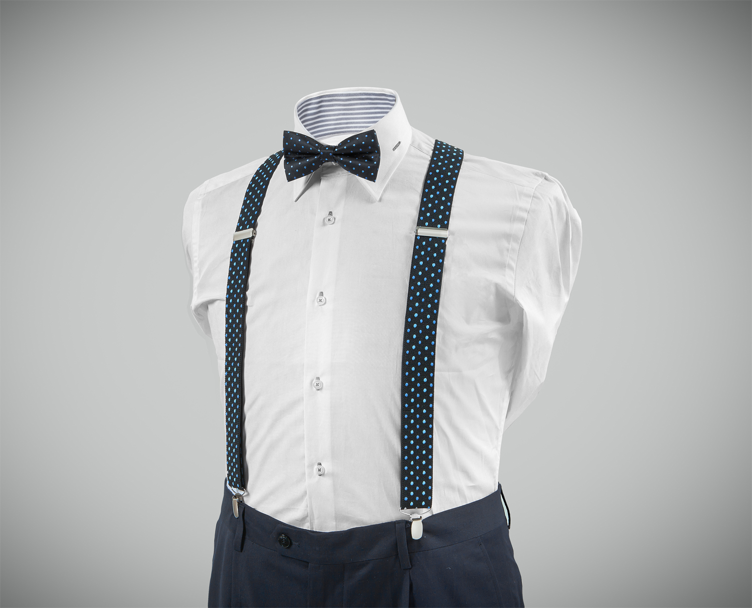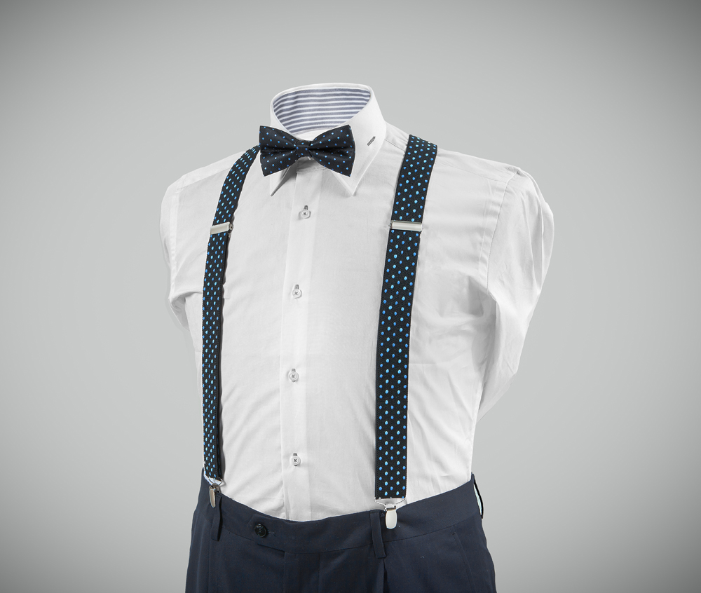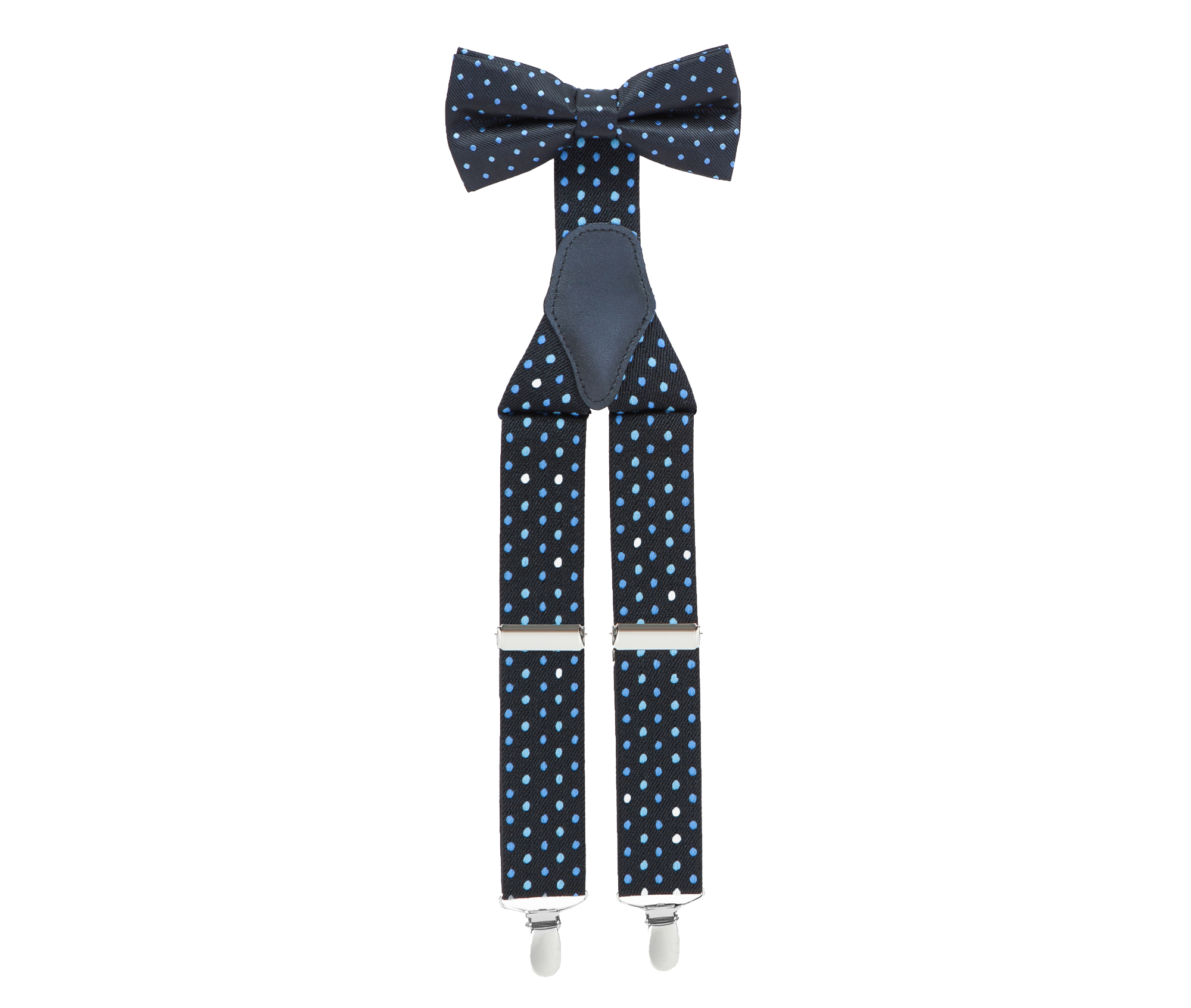 "Exquisite, adjustable-size braces + bow tie combined set, 35mm width, made with fine, resilient material, finished in a dark-blue colour with blue and indigo dots. Metal chrome clip and leather-strap button fasten, included."