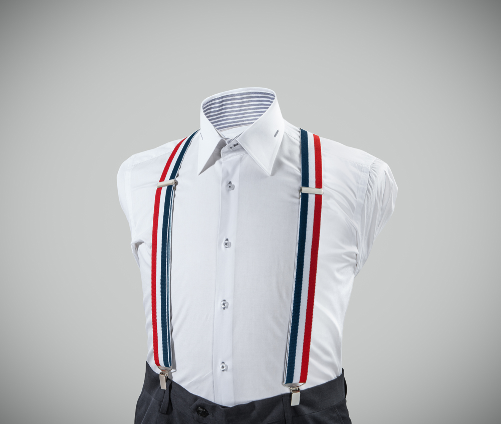 "Adjustable-size braces, 35mm width, realised in exquisite, resilient material , triple solid-colour, blue + white + red. Available with metal chrome clip fasten."